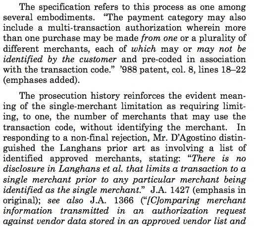 In this way, the Federal Circuit found that the prosecution history and specification reinforced the evident meaning of the claim language, irrespective of whether there was any disavowal. The claim language could not be read so broad as to include both a pre-identified chain of stores and a later selected specific store in the chain. The Federal Circuit used the Board’s reasoning to point out that if the merchant is the Target chain of stores, then the claims exclude that scenario because that example does not limit the transaction to that single chain, but rather a single store in the chain.