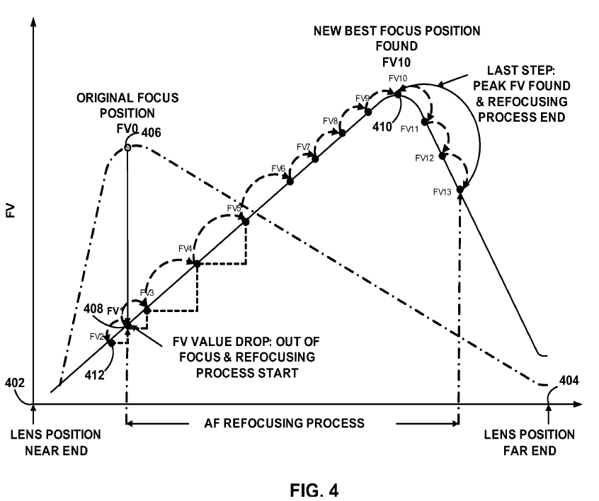Fig. 4 illustrates the focus value (FV) as a function of the lens position. The optimal focus of an original object is shown at FV0, but when a new object comes into frame and a refocus process occurs, tbe FV drops (from FV0 to FV1) before the lens moves. Then, the lens is adjusted step by step until it reaches the new optimal value (FV10). During the refocus process, the direction of movement is determined by finding which way causes the FV to increase. The blurriness level is determined for every frame until the new optimal focus is obtained. As such, this algorithm provides certain functionality that one can appreciate through every day life. Whether that had something to do with the decision, we will likely never know.