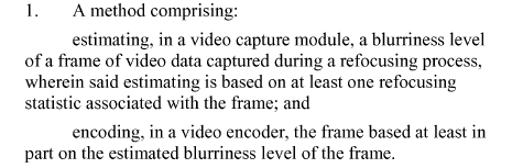 Claim 1 on appeal is reproduced below and relates to a specify way of encoding videa data based on an estimated blurriness of the frame, the estimating using a refocusing statistic associated with the frame. Thus, claim 1 requires an estimation, which is purely a determination made in software, along with an encoding, also something that is purely within the software.