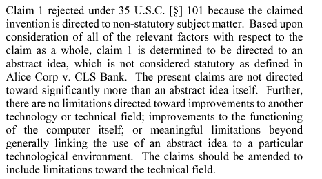 Yet, the PTAB reversed the Section 101 rejection. The Examiner had maintained that the claim was directed to an abstract idea, but actually never even identified what that abstract idea was. The rejection was typical of what has become common practice over the last few years: