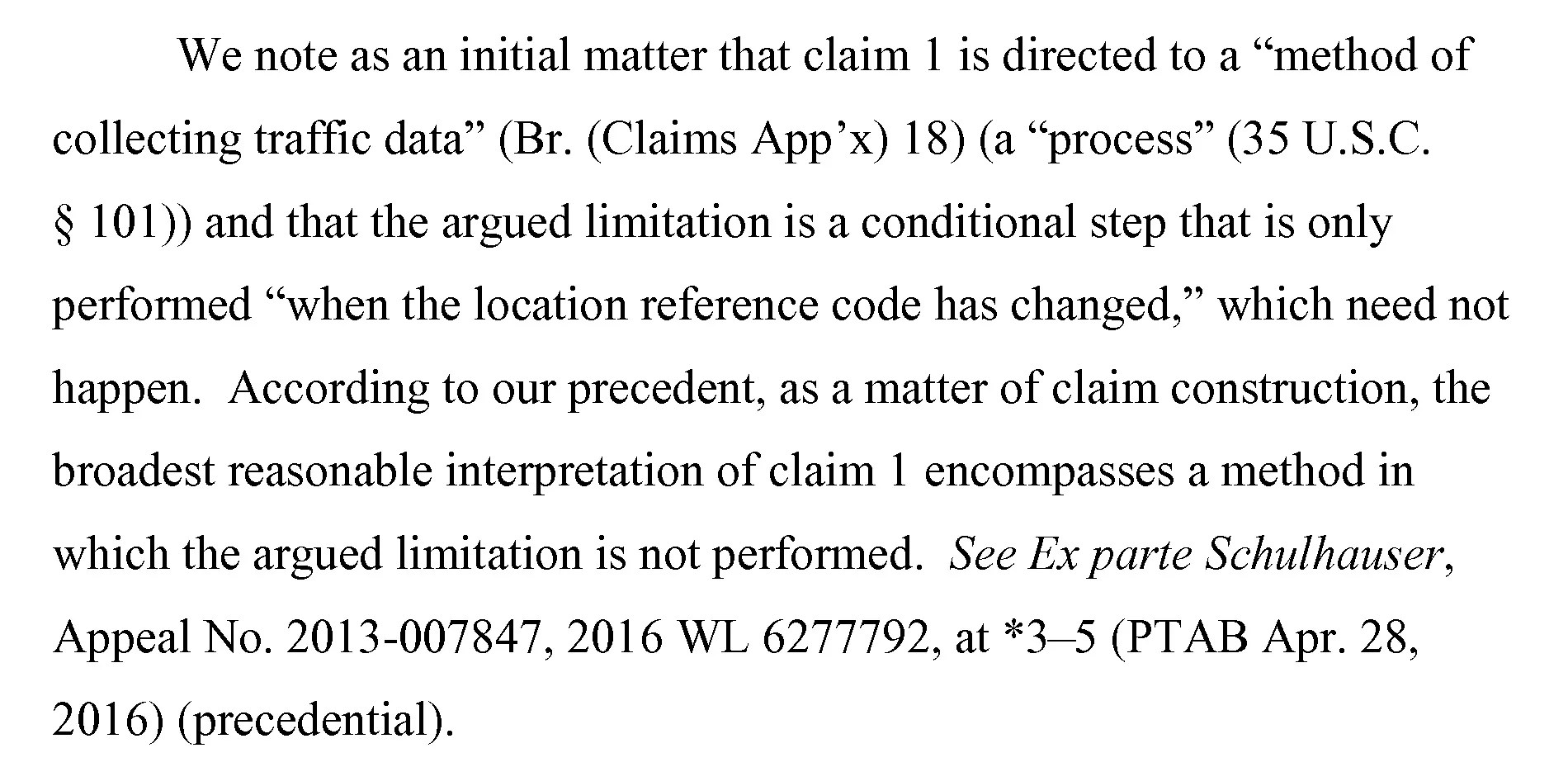 So, while the PTAB does not directly find that all of the claimed elements (a)-(d) are required, the rest of the decision goes on to analyze the cited references and find that they do not disclose limitation (d), implying that said limitation must be considered when analyzing the claims. Interestingly, ALJ Horner wrote the decision in Schulhauser as well as in this case where the rejection was reversed!