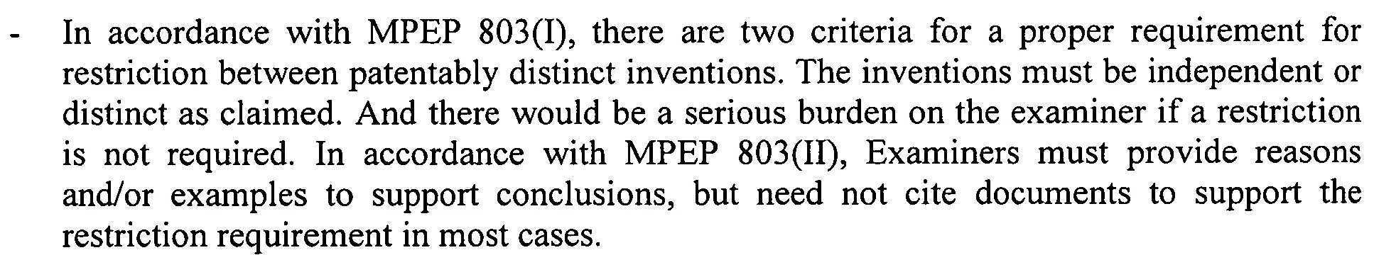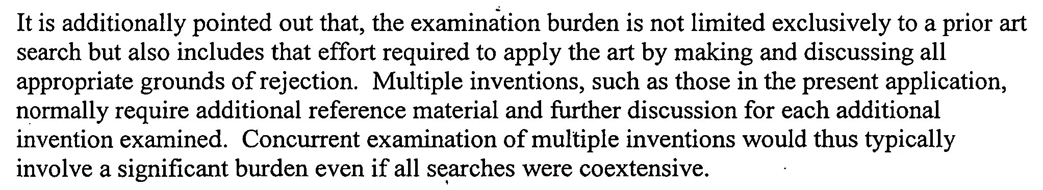 Nevertheless, Petitions for review of restriction do have a place and even the Office of Petitions has shown that it will sometimes provide a meaningful check on unreasonable examiner behavior. One area of seemingly inconsistent review, however, is with respect to the search burden requirement. As discussed in a previous post (here), and as set forth in MPEP 803, every restriction requires not only distinctiveness, but also that there be a serious search burden.