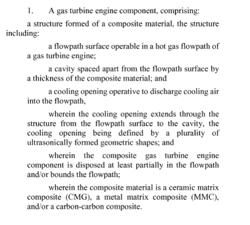Rolls-Royce recently relied on declaration evidence successfully in an appeal relating to composite gas turbine engine components (SN 12/847,608). The issue related to whether a certain limitation, as interpreted under the Broadest Reasonable Interpretation (BRI), was a product-by-process limitation or a structural limitations. As skilled prosecutors know, this distinction can be critical as product-by-process limitations are effectively useless in all but the rarest of circumstances. Claim 1 is reproduced below, and specifically requires that the cooling opening is “defined by a plurality of ultrasonically formed geometric shapes.”