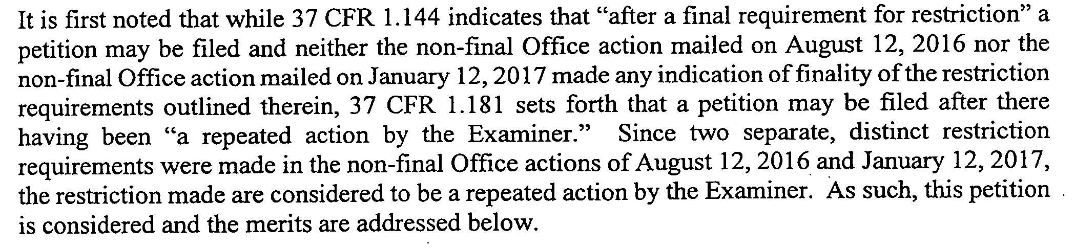 But what happens if the examiner repeatedly enters new restrictions on each action and never makes a restriction final? All is not lost. This issue occurred in US 14/800,061 (currently under appeal). The Office of Petitions confirmed that while the restriction was not final, it was still petitionable as a “repeated” action. From the Petition Decision:
