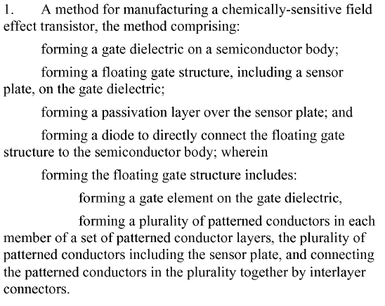 Life Technologies Corporation is the owner of US 13/607,128, directed to methods for detection of analytes associated with or resulting from a nucleic acid synthesis reaction. Specifically, the invention provided a method for manufacturing a chemically-sensitive FET. The inventors recognized issues with known approaches aimed at reducing possible gate oxide degradation during plasma processing. The specification explained that: