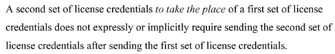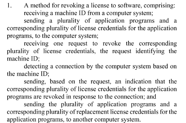 Microsoft implicitly relied on an argument that the sending of the replacement license credentials must be after the sending of the indication that the license credentials are revoked. Specifically, Microsoft argued that in the cited art, the activation (or re-activation) does not send license because it is performed during a purchase occurring before the activation. The PTAB found this unpersuasive as not commensurate with the scope of the claims. Namely, the PTAB found that reliance on antecedent basis was improper, and that the claim did not require a specific order. The mere fact that the second “sending” element referred to “replacement” was insufficient because the dictionary definition of replace (to take the place of) had no temporal aspect. From the PTAB’s opinion: