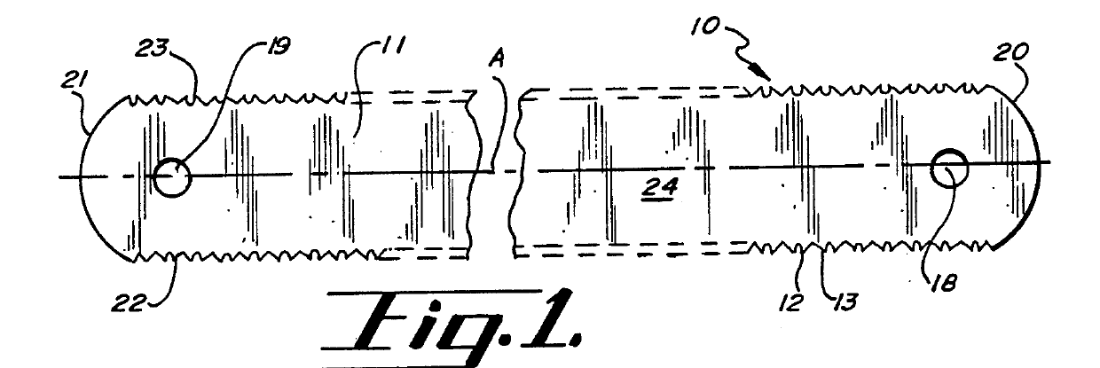 During prosecution, the Examiner relied primarily on a hacksaw blade as anticipating the claimed reciprocating saw blade. One issue on appeal was the requirement of the attachment portion including a tang and an aperture configured to couple to the reciprocating saw. The Examiner relied on the holes at the ends of the hacksaw blade, shown in FIG. 1 of the prior art (Baker) below: