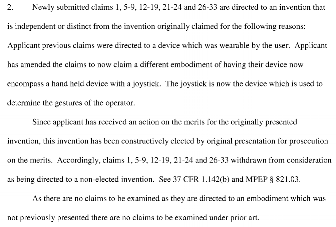 So let’s review an example to illustrate the issue. US 13/519,400 relates to a control system for a surgical navigation system using gesture control. After several rounds of prosecution, the applicant amended the claims further to add some specific limitations related to also including a gesture support attached to the user. Note that the gesture support was in addition to the gesture detection.