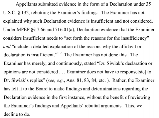 So, what do you do if an examiner and/or supervisor simply refuse to consider declaration evidence? One approach is to petition. Another is to use their failure as a basis for reversal in an appeal (as while this issue is partly procedural, it is also substantive and so both petition/appeal avenues are open). Using bigpatentdata.com, it is easy to find some examples of this. Consider US 13/045,932, where the applicant appealed a rejection in which the examiner expressly refused to consider and/or respond to declaration evidence. The entire appeal was decided* based essentially on the violation of MPEP 716.01 (and the legal theory of appeals). From the PTAB’s decision