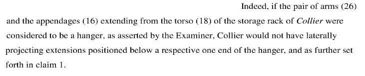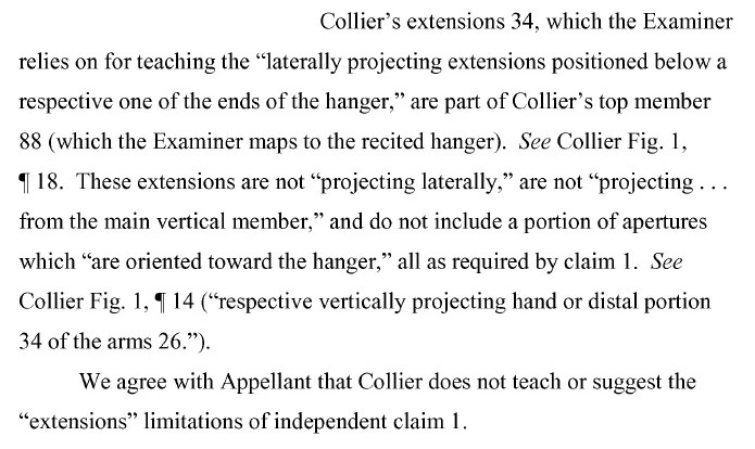 The prior art cited by the Examiner, Collier, had some similar features, but the hanger was quite different. In Collier, the arms 26 and appendages 16 are the hanger, according to the examiner. But, the examiner also contended that extensions 34 were “positioned below a respective one of the ends of the hanger.” Of course, these extensions are not projecting from the main vertical member, among other deficiencies.
