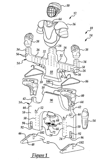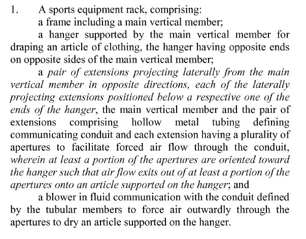 So Dan Durham invented a new type of portable equipment hanger to address these challenges and technical deficiencies in the available hangers on the market. Dan retained a patent attorney and filed a patent application for his invention. The invention provides a hanger system with a blower to direct air to the items hanging on it to dry them. Below is claim 1 on appeal, with several areas emphasized by the Board (PTAB),
