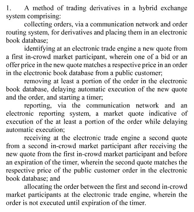 Importantly, the PTAB goes on to cite to the specification, which explains the purpose of the temporary restraint on execution being to allow a grace period within which the other in-crown market participant quotes or orders may be submitted at the best prices represented by the new quote. The specification further touted the advantage of this feature as encouraging more participants to quote at the best price and removing any communication or hardware advantage. Thus, the PTAB concluded that the use of the claimed timing mechanisms and associated restraints provides a specific technological improvement over the prior art. The dissent disagrees that the timing feature is technical, and alleges that it is a well known feature that would be appreciated by one skilled in the art.