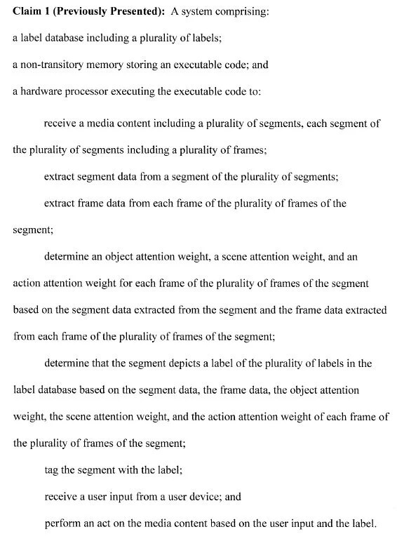Disney engineers are actively pursuing AI-based inventions. In this post, we review an invention for a tool that can automatically annotate actions in videos to better enable other actions, such as AI-based learning of activities in video (15/202,471). The approach uses attention weights of media content frames for determining the actions depicted in the media. Claim 1 on appeal is below. Of importance on appeal is the limitation that the system determines, for each frame of a segment, an object attention weight, a scene attention weight, and an action attention weight based on segment data extracted from the segment and the frame data extracted from the frame.
