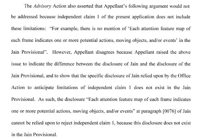 The Rejection relied on a prior art reference (Jain) that was only prior art through its provisional filing. The examiner relied on disclosure in the later-filed non-provisional application. Disney pointed out that the cited paragraphs being relied on by the examiner, were no present in the provisional filing. As such, the rejection could only rely on the later-filed non-provisional, which was not prior art.