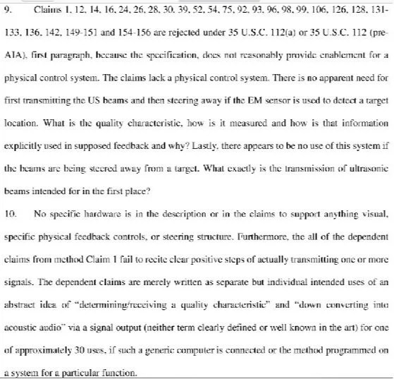 The Office had rejected the claim as lacking written description, being unclear, omitting essential elements, being obvious, being non-statutory subject matter, and not being enabled. The appeal brief addressed each of these, but according to the PTAB did not fully address the enablement rejection. The enablement rejection was set forth as follows in the final rejection: