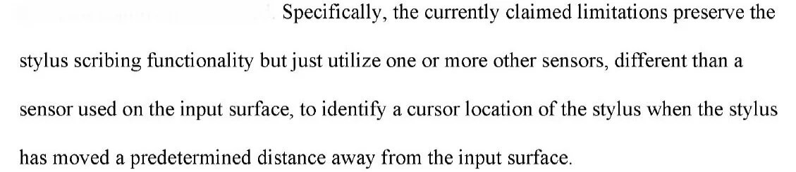 There is some draw to what Lenovo says. Their claims are aimed at continuing stylus operation even at large distances, which is quite different than the cited art. None of the cited references really addressed the issues solved by Lenovo’s application. However, the way the argument was made, and the actual claim language, did not converge. Claim 1 says nothing about preserving stylus scribing functionality. The Examiner’s rejection used only the mode switch based on distance concept (forgetting that the mode switch was one that disabled writing) in combination with a secondary reference that changed sensors for a stylus in air writing mode as opposed to tablet writing mode. None of the references maintained the cursor location on the input device through a mode switch.