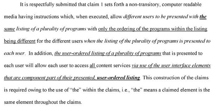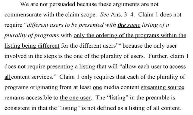 As illustrated, the applicant utilized various combinations of underlining, bolding, and italicizing providing a stratification of emphasis. And while this introductory paragraph does not appear intended to be the primary argument against the cited references (but rather was presented more as an introductory paragraph), it nevertheless paraphrased elements of claim 1 and was presented as being what was”set forth” in claim 1. It is always dangerous to paraphrase claim elements, and even more so when using emphasis. It gives the other side (or the PTAB) the ability to focus right in on what has been emphasized as having a fundamental flaw. Here – that flaw is that claim 1 did not actually require the paraphrased language. The PTAB jumped on the emphasized language and used it to undercut the applicant’s arguments: