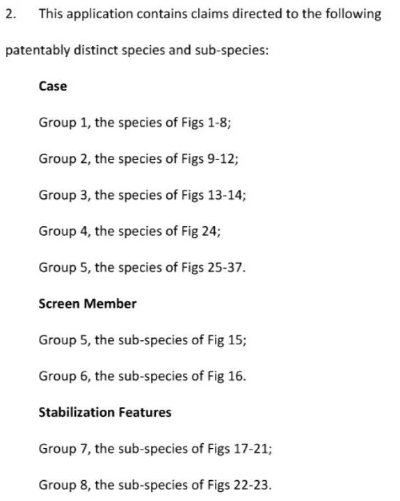 The applicant elected Groups 3, 5 (the second 5 presumably), and 7. Surprisingly, the applicant elected “without prejudice” which was interpreted as “without traverse.” Nevertheless, later during prosecution, the examiner used the restriction to only consider the elected figures (and corresponding description in the specification) in terms of support. For example, the examiner explained that “the problem is that there is no description of [claimed features] in the specification text or in elected Figs 13-14 …”. The examiner provided no support in the statute, CFR, or even MPEP, for this position.