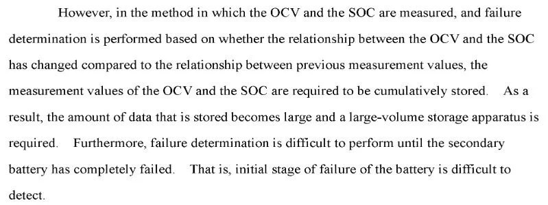 What is noteworthy about this case is that the specification contained extensive details about a technical problem with the prior art related to the need for large amounts of computer memory. From the specification (discussing issues with open current voltage (OCV) monitoring and state-of-charge (SOC) monitoring), here is an example: