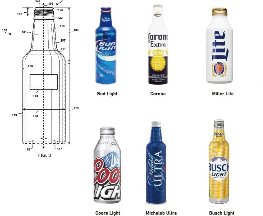 Turning back to the Anheuser-Busch case (Appeal 2023-003285, Application 17/017,440), the images below show the bottle configuration from the patent application, as well as some examples of various aluminum bottles on the marketplace.