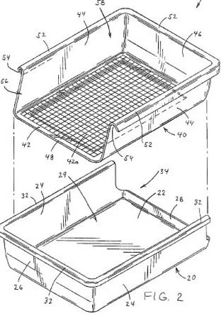 The cited art relied upon a combination of the following two devices, (and then further modified with two other references). First, the litter pan of Hecht is cited, but of course it is missing the bottom wall of the base structure including an exterior area that extends outwardly of a perimeter defining an interior area of the base member, with a portion of the perimeter of the base member being free of any upraised wall(s) where the exterior area extends outwardly.